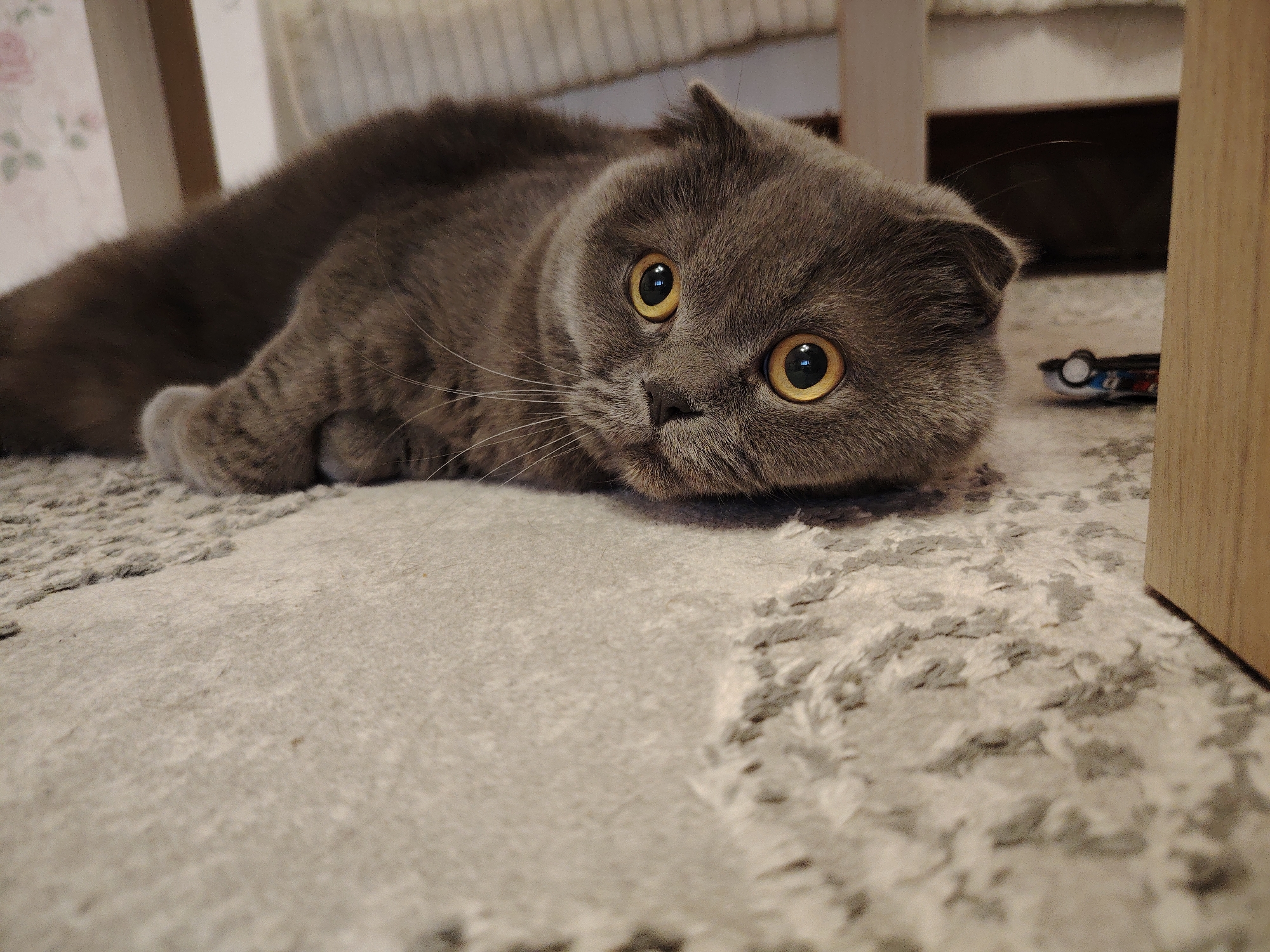 A gray Scottish Fold cat is lying on a light gray, textured rug. The cat is facing the camera with wide, yellow eyes. Its paws are tucked underneath its body. A toy car is visible near the cat, partially obscured by a wooden leg of a piece of furniture. The location is Марковский, Russia.