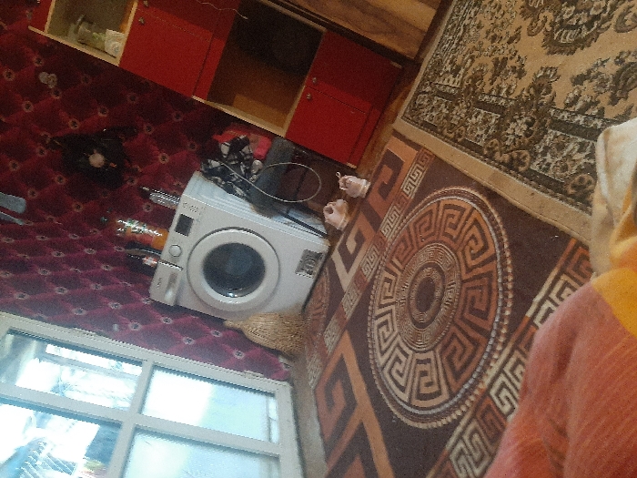 The image depicts an interior room in Marinka, Bulgaria, characterized by patterned walls and floor coverings. A white front-loading washing machine is positioned against a dark red, possibly tufted, patterned wall, to the right of a white-framed window with multiple panes. On top of the washing machine are an orange-capped bottle and a black bottle. A natural fiber broom leans against the wall to the left of the washing machine. To the right, a red modular shelving unit with both open and closed sections is present. Two light-colored children's shoes are situated on a prominent brown rug featuring a large central circular Greek key design and a repeating border pattern. A second, lighter-colored rug with a floral or traditional motif covers the floor to the right. The bottom left foreground is occupied by a reddish-orange textile object. No individuals are visible, and no actions are explicitly depicted.