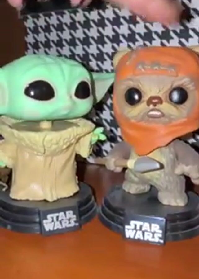 two Star Wars bobblehead figures on a wooden surface. One is "Baby Yoda" also known as Grogu, and the other is an Ewok. A hand with painted black fingernails moves in and out of the frame near the top of the bobbleheads and a black and white patterned box is in the background. Both figures are standing on black bases that have "STAR WARS" printed in white letters.