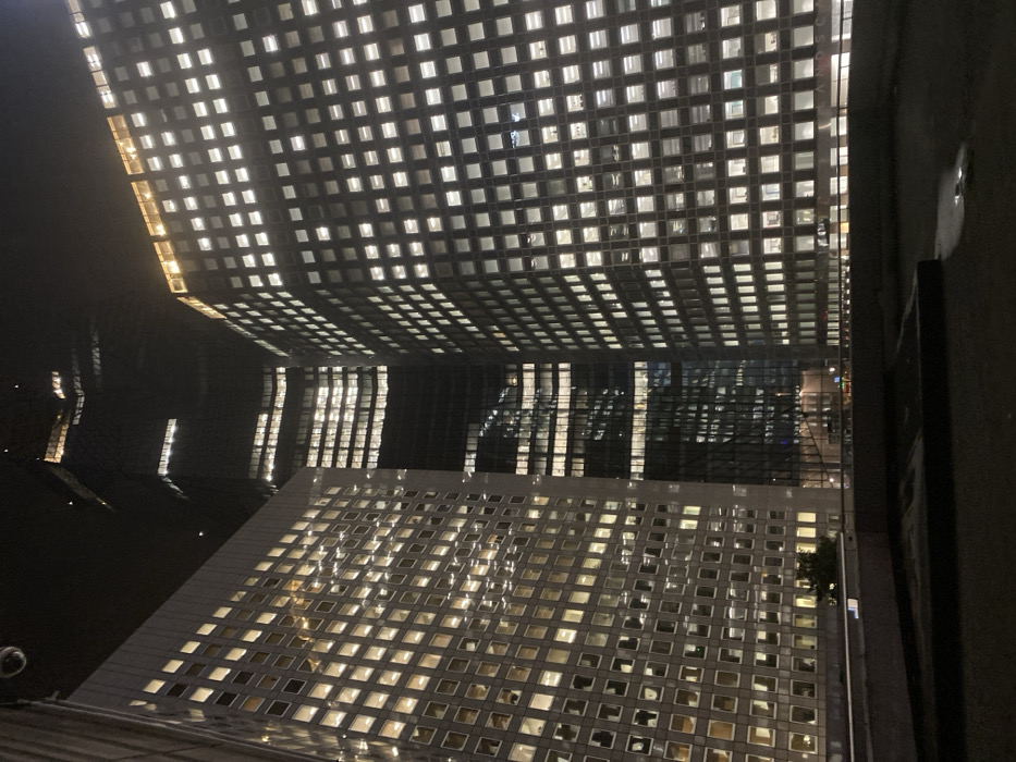 An upside-down view presents a grid-like skyscraper. The illuminated windows create a pattern against the dark facade. Below, a similar structure, presumably a building's surface or reflection, mirrors the upper skyscraper's lit squares. The image's orientation gives an abstract, dizzying perspective.