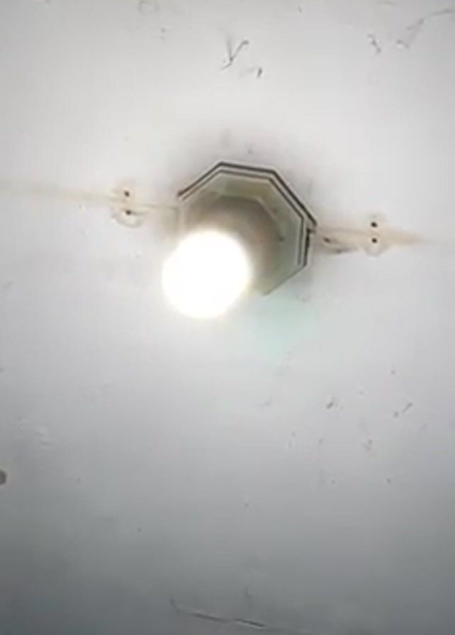 A lightbulb is mounted on a ceiling. The bulb emits a bright white light and is surrounded by an octagonal housing. The ceiling is white with a textured surface, and shows some minor stains. The camera is static, looking up at the light.