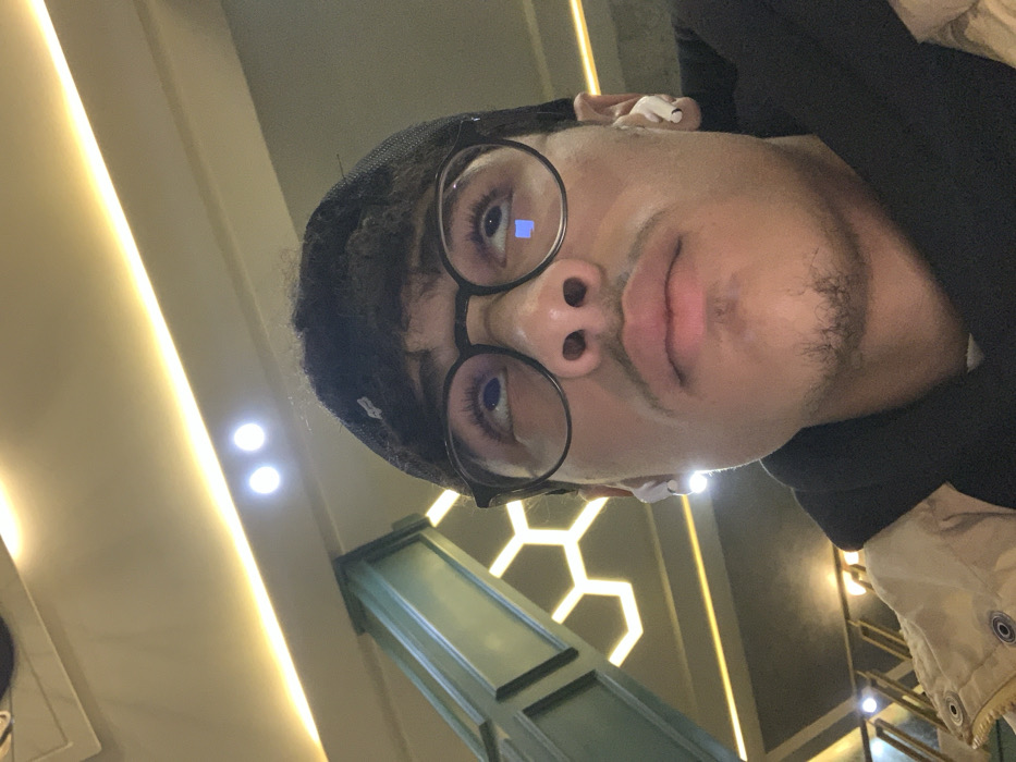 A selfie captures a person wearing round glasses and a black cap. They have dark hair and are wearing earbuds. A black hoodie is visible around their neck. In the background, a vertical, green, paneled structure is noticeable, set against a wall with a honeycomb pattern illuminated by warm lighting. Additional strip lighting stretches along the ceiling.
