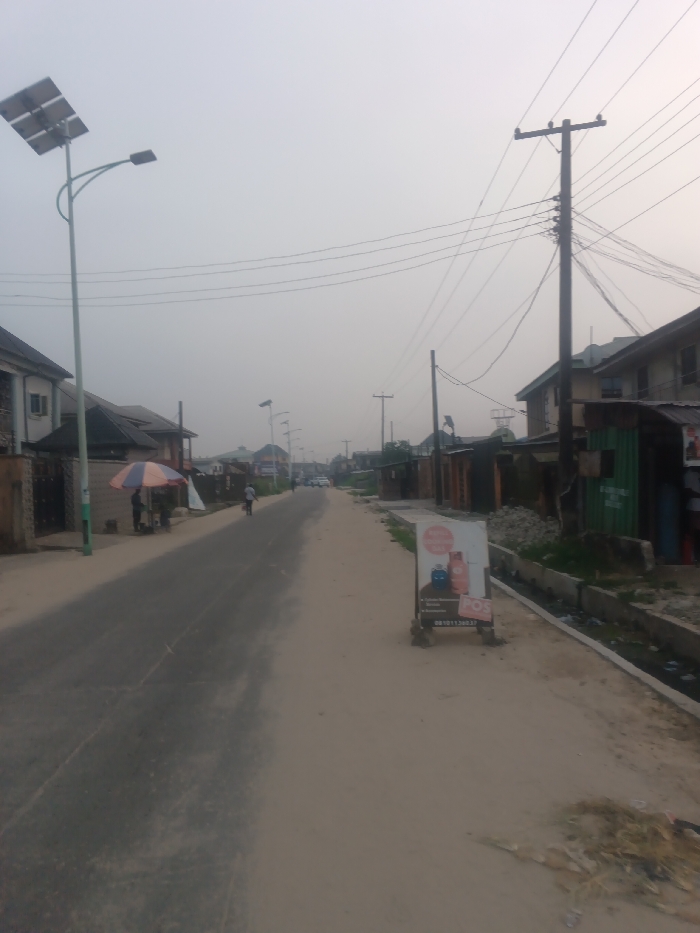 A street view showcases a somewhat desolate scene. The road, displaying signs of wear, stretches into the distance under a hazy sky. Buildings line either side, a mix of residential structures and small businesses. Utility poles with a web of wires add to the unkempt aesthetic. A solar-powered street lamp stands tall on the left. A few individuals are visible; one under an umbrella stand and another is riding a bicycle. There's also garbage on the side of the road.