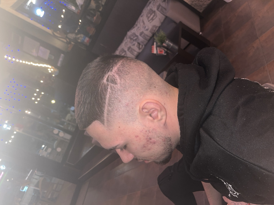 A male individual is depicted in a profile view, facing left, seated indoors in the city of Yambol, Bulgaria. He has a faded haircut with a shaved design featuring a diagonal line extending from the hairline to the crown, where it meets a small triangular or V-shaped shaving. Visible on his left cheek and jawline are multiple acne blemishes and light facial stubble. He wears a black hooded sweatshirt with subtle white markings and lint. The background on the left shows a large glass window or door reflecting blurred blue and yellow lights and indistinct forms. To the right, a dark sofa with a patterned cushion, a small dark side table with a metallic planter containing artificial green foliage, and shelving units with various items are visible. The flooring is composed of dark brown wood-patterned tiles. The scene is dimly lit, consistent with an evening or nighttime environment.