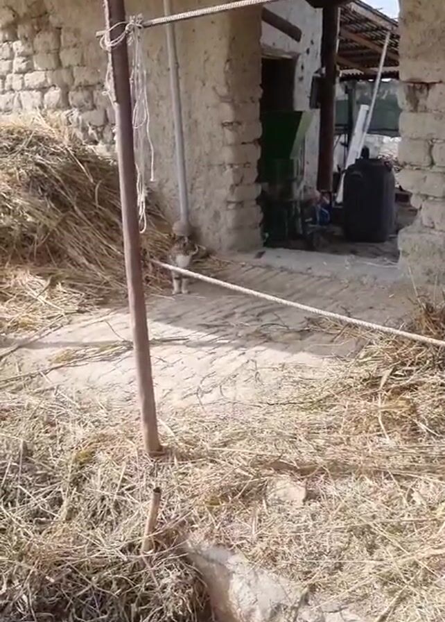 dusty outdoor scene with piles of straw and old stone structures. A tabby cat stands near a doorway in one of the structures. A person is heard making "pssh pssh" sounds to attract the cat's attention. A rope lies on the ground. The area appears to be a farmyard or storage area. In the background, there are other objects including containers.