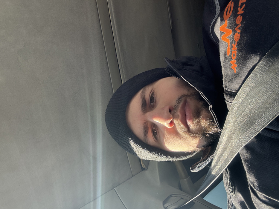 A male individual is depicted in a medium-close-up shot within the interior of a vehicle. He is positioned facing the camera, wearing a black knitted beanie and a black jacket. Facial hair, consisting of a beard and mustache, is present. A light grey seatbelt is visible across his chest and shoulder. The right side of his jacket (viewer's left) displays orange text in Cyrillic, reading "Макс ЕЛЕКТ" (Max Elekt). Bright sunlight, causing a lens flare in the upper left, illuminates the scene from the left. The vehicle's interior headliner, light grey and exhibiting signs of wear, is visible in the background. No specific visual identifiers are present within the image to confirm the location in Kardzhali, Bulgaria.