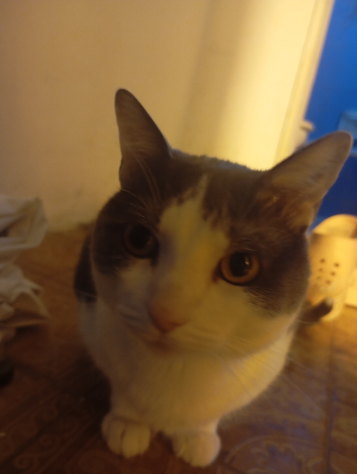 A gray and white cat stares directly at the camera, its large amber eyes holding attention. The feline is mostly white on its face and chest, with gray patches on its head and ears. The cat sits on a wooden surface, with a hint of off-white fabric visible to the left. A bright light source casts a warm glow on the cat and the surrounding environment, making the colors appear richer. The close-up shot emphasizes the cat's engaging gaze and soft fur.