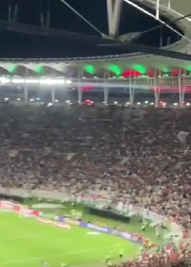 packed stadium with a soccer field, illuminated by stadium lights. The stadium appears modern with a white, arched roof. The stands are full of people, and there are flags visible amidst the crowd. A banner is visible along the side of the field. The overhead lights of the stadium are accented with red and green lighting.