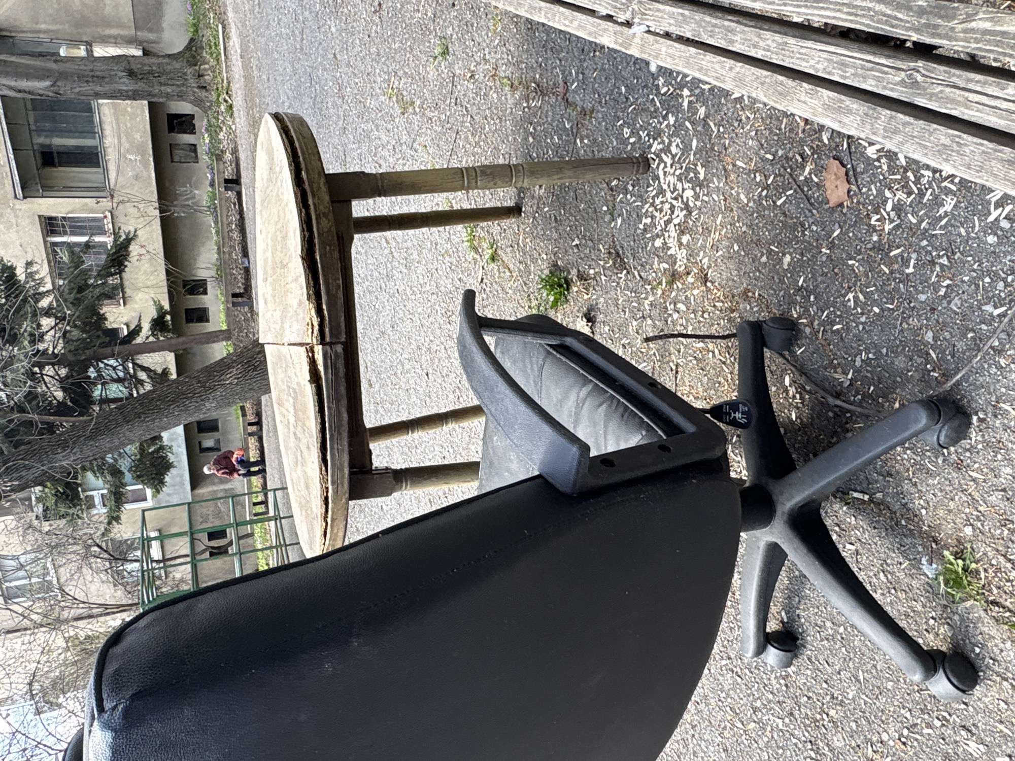 - "The scene depicts a discarded black faux leather office chair and a heavily damaged round wooden table on an asphalt or gravel surface in an urban residential area of Sofia, Bulgaria" by FM-k8XGj2, licensed under CC BY 4.0