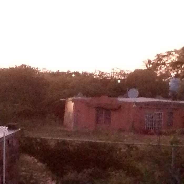 A reddish-brown building sits nestled among dense trees, possibly a residence. Two satellite dishes and a water tank are visible on the roof. An open doorway radiates a soft glow. The scene unfolds under a muted sky, indicative of dusk or dawn. The image has a slightly obscured, grainy quality, suggesting it was taken at a distance or in low light. Vegetation and a wall surround the building.