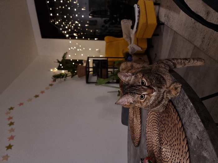 A brown tabby cat lies on a woven surface. The cat faces forward, looking directly at the camera with its large, round eyes. Behind the cat, partially visible, are yellow chairs and a black metal shelf with plants. In the background, a wall is adorned with string lights and a decorative chain of star-shaped cutouts. The room has a warm, inviting atmosphere.