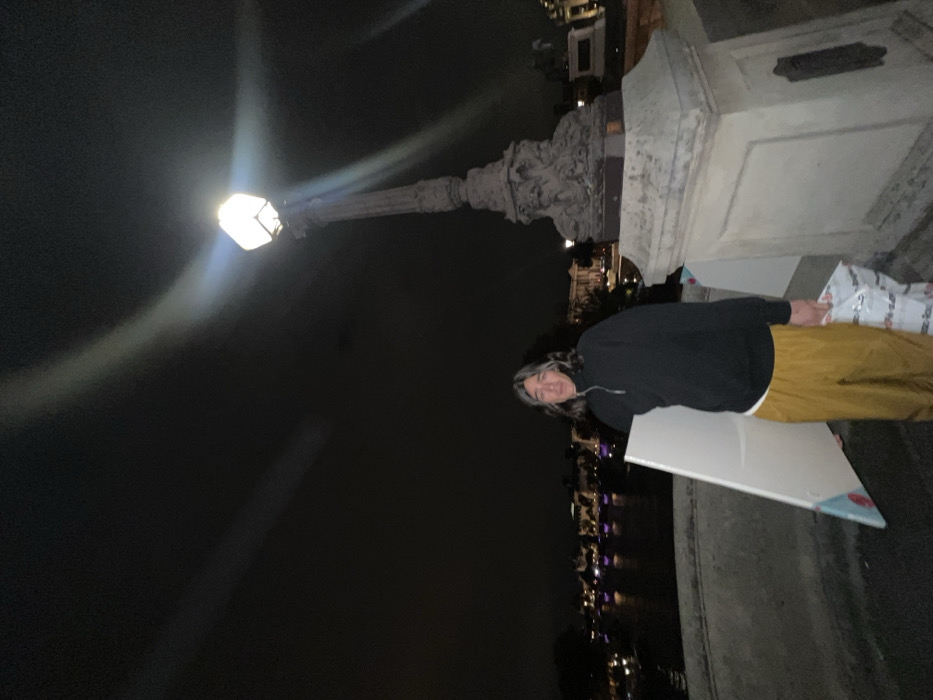 A nighttime, eye-level photograph shows a young adult standing on the Pont Alexandre III in Paris, France