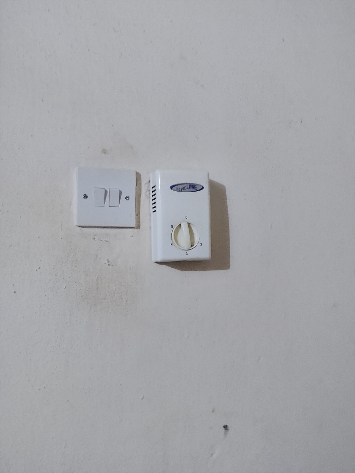 A light switch with two switches is attached to a white wall. To the right of the light switch is a Newclime-branded thermostat with a knob that can be adjusted from 0 to 5. The walls are plain white with a few smudges on them.
