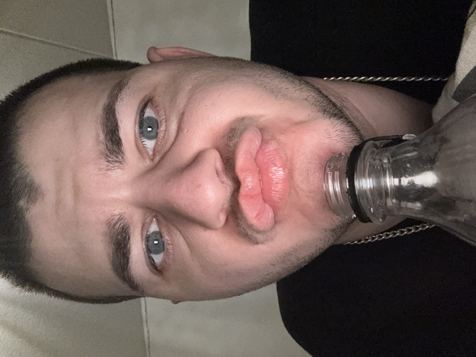 A male individual with short, dark hair, blue-grey eyes, and stubble on his chin and jawline is depicted in a close-up, head-and-shoulders shot. He wears a dark shirt and a silver-colored chain around his neck. His lips are significantly puckered forward, creating a "fish face" expression. A clear glass bottle, lacking a cap and featuring a black rubber ring below the threaded neck, is positioned directly beneath his chin. The bottle appears empty or contains a transparent substance. The subject stares directly forward, engaging the viewer. The background consists of indistinct light-colored surfaces, suggestive of an indoor environment. This scene is located in Vantaa, Finland.