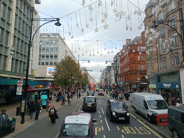 - "The image presents a wide-angle, slightly elevated view looking eastward down Oxford Street in London, United Kingdom, on an overcast day" by FM-IaMde2, licensed under CC BY 4.0