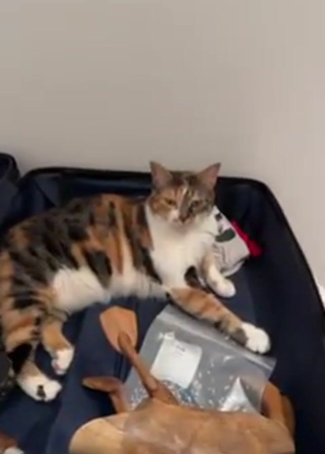 A close-up, eye-level shot reveals a calico cat lying in an open, purple suitcase. Other items inside the suitcase include a wooden object, a clear plastic bag, and clothing. A person filming the cat is speaking in Spanish. The cat appears unconcerned with the camera. The background is a plain, light-colored wall.