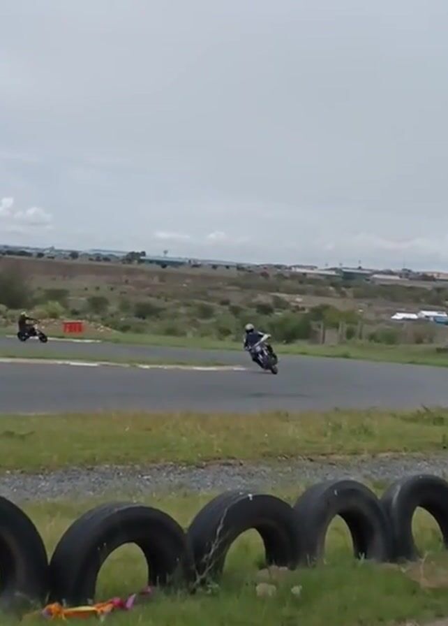 The video captures a scene at an outdoor racetrack on a cloudy day