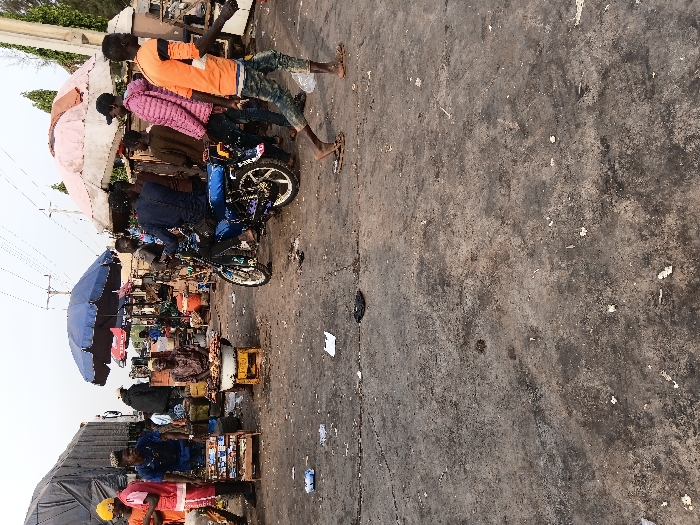 A bustling outdoor marketplace is captured in a low-angle, full shot. Several people are walking on or near a motorbike parked in a well-worn, slightly dirty area. To the left, vendors operate under canopies and umbrellas. A variety of merchandise is displayed. A truck with covered goods and people in bright clothing are also visible.