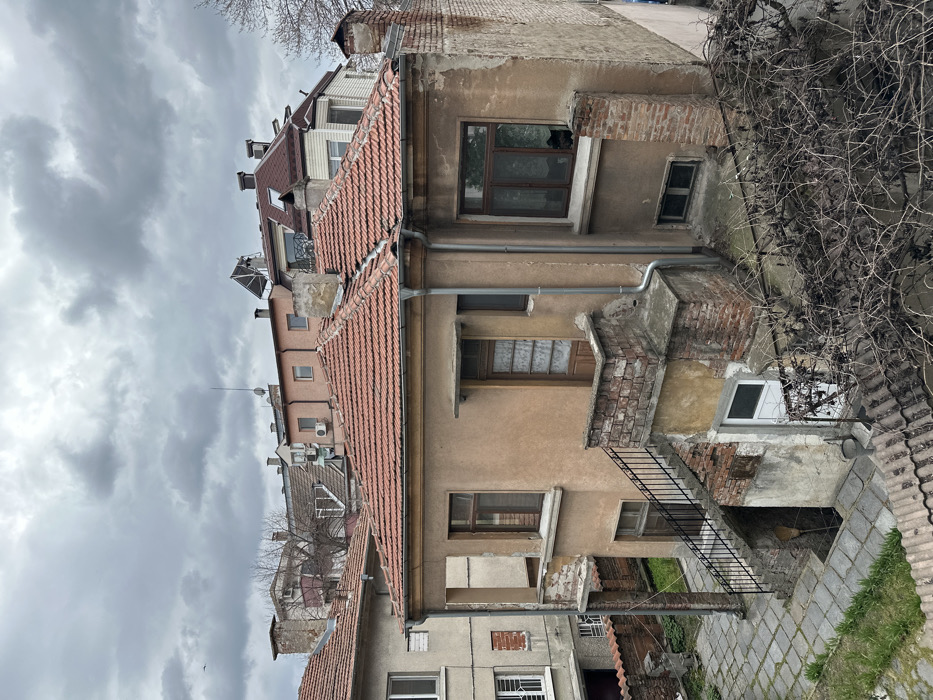The image displays an urban residential scene in Plovdiv, Bulgaria, viewed from an elevated position under a heavily overcast, grey sky. The central subject is a two-story building with a light brown, weathered stucco facade, showing significant peeling and exposing brickwork in various areas. Its roof is composed of reddish-orange tiles, some appearing misaligned. A vertical metal downspout is affixed to the right side of the building's exterior. On the upper floor, a large rectangular double window on the right features a dark-furred animal, consistent with a cat, observing the exterior. To the left of this window, a wooden door with glass panels is located beneath a small, rectangular awning. Further left, a section of the wall appears to be an open window frame or a missing architectural element, revealing a dark interior space. An external black metal staircase with railings descends from a small, elevated brick landing on the building's facade, leading to a paved courtyard below. This courtyard is laid with grey square tiles, exhibiting minor weed growth in the cracks, and a small area of green grass to its left. A white door with a small window provides access to the building's lower level from the courtyard. A metal bucket is positioned near this white door, and a broom or long-handled tool leans against the wall under the staircase. The lower right foreground is dominated by a dense, bare, deciduous vine or bush with tangled branches, partially obscuring the lowest parts of the scene. In the mid-ground and background, a dense collection of other residential buildings is visible, featuring various roof styles including red tiles and darker materials. Several rooftops display antennas, satellite dishes (one prominent parabolic dish is visible on a roof in the upper right background), and external air conditioning units. Bare trees are interspersed among the structures, suggesting a non-summer season. No human figures are present.