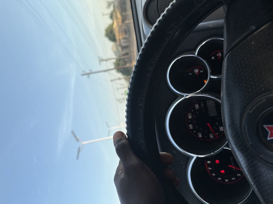 A driver's-eye view from inside a car, with a hand gripping the steering wheel. The dashboard gauges are visible, showing speedometer, RPM, and fuel level. Outside the windshield, the sky is clear and sunny, with utility poles lining the road. The car appears to be in motion.
