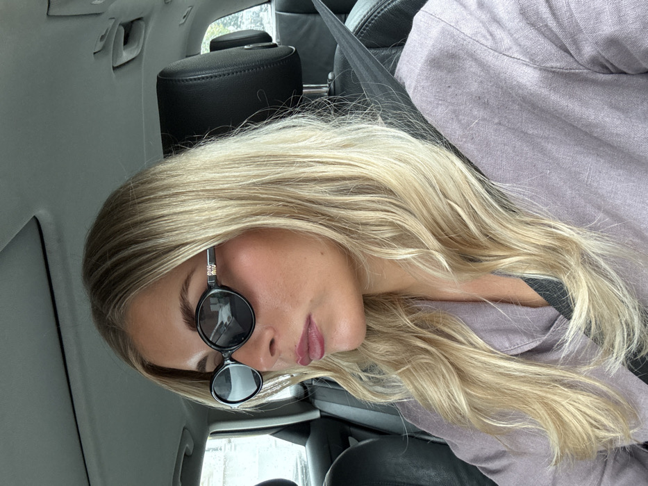 A female individual with long, wavy blonde hair, light-tanned complexion, visible blush, and pink lipstick is depicted in a vehicle's interior