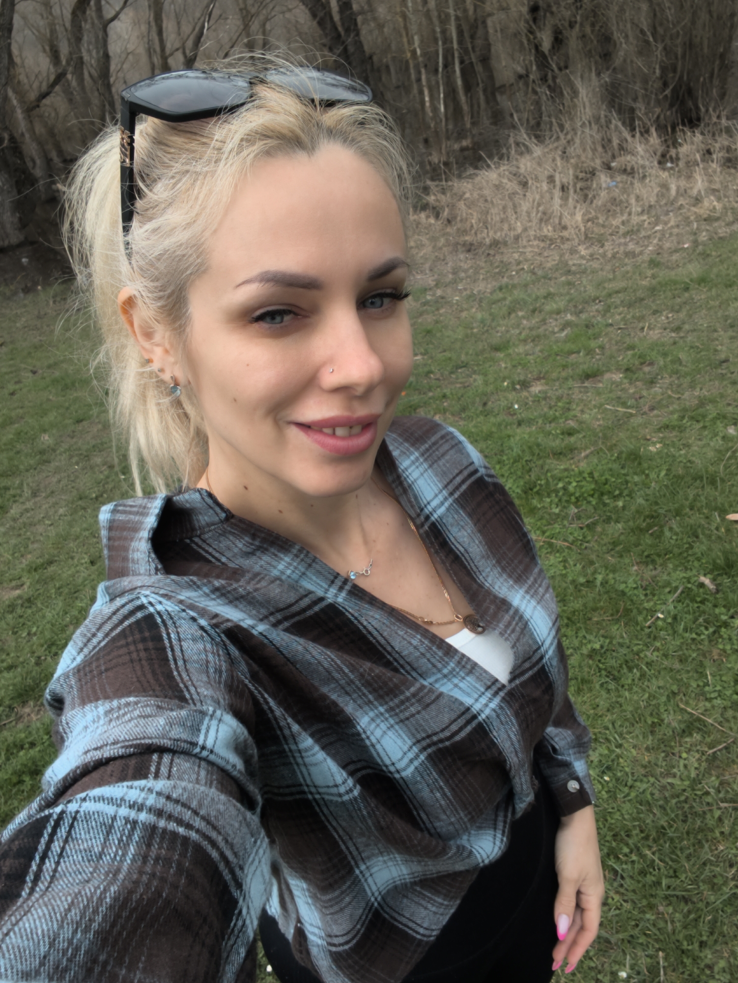 A woman with blonde hair and blue eyes poses for a selfie outdoors in Орлиновский округ, Ukraine. She is wearing a brown and blue plaid shirt over a white top and black pants. Sunglasses are perched on her head. She has a nose piercing and wears jewelry including earrings and necklaces. The background includes trees and green grass.
