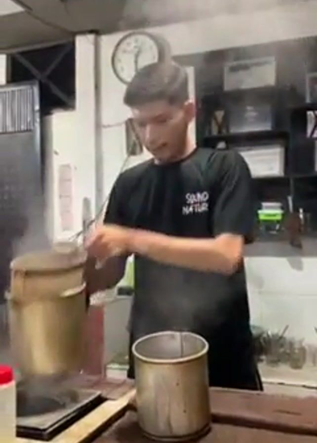 man making coffee in a kitchen or cafe. The man is young, with short dark hair, and is wearing a black t-shirt with white lettering. He is standing behind a counter made of a dark, textured material. On the counter are three large metal cans, two of which contain a dark liquid, presumably coffee. Steam is rising from the cans. The man picks up one of the cans filled with liquid and pours it into another can. The man looks at the camera and makes a gesture with his hand. Behind him are various shelves, a clock on the wall, and a partially visible refrigerator. The lighting in the room is bright and appears to be fluorescent.