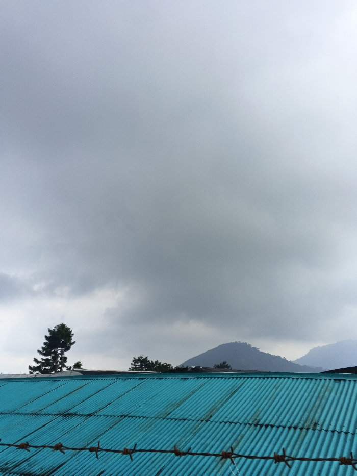 The image presents an exterior scene in Koipa, Papua New Guinea. A heavily overcast, grey sky dominates the upper two-thirds of the frame. The lower third is occupied by a teal-colored corrugated metal roof. A single strand of barbed wire runs horizontally across the extreme bottom edge of the image, positioned in front of the roof. Above the roofline, a tall, dark green coniferous tree is visible on the left. In the background, a series of dark green, forested mountains and hills extends, with their upper sections partially obscured by the prevailing low cloud cover. No individuals, animals, or human activities are discernible within the frame.