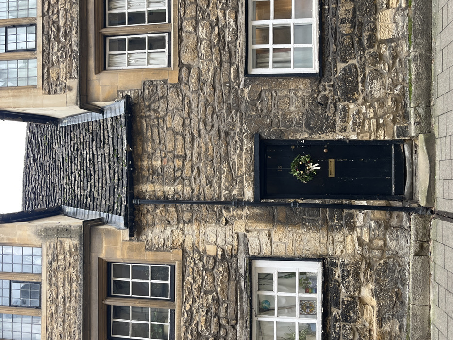 The image displays the stone facade of a building located in Oxford, United Kingdom. The structure is characterized by walls constructed from irregular, light-brown and grey stone blocks. A steep, dark grey slate roof, showing signs of moss or lichen growth, is visible in the upper-center, connecting two sections of the building. Four windows are present: two upper-level, multi-pane windows with dark frames, positioned above the main wall sections to the left and right. Below these, two white-framed, multi-pane casement windows flank a central entrance. The lower-left window contains internal decorations, including a circular peace symbol and a smaller, square stained-glass-like ornament. The lower-right window is obscured by white curtains. A black vertical downpipe runs along the stone wall, positioned to the left of the doorway, extending from beneath the roofline to the ground. The central entrance features a dark, likely black, wooden door with the number "13" affixed above it. A brass letterbox and a dark handle are visible on the door. A circular wreath, composed of green foliage, pinecones, gold and white spherical ornaments, and a white ribbon, hangs centrally on the door. The building rests on a grey paved surface, with a narrow metal grate or drain cover visible near the base of the wall. The sky above is overcast. No individuals are present, and no actions or interactions are depicted.