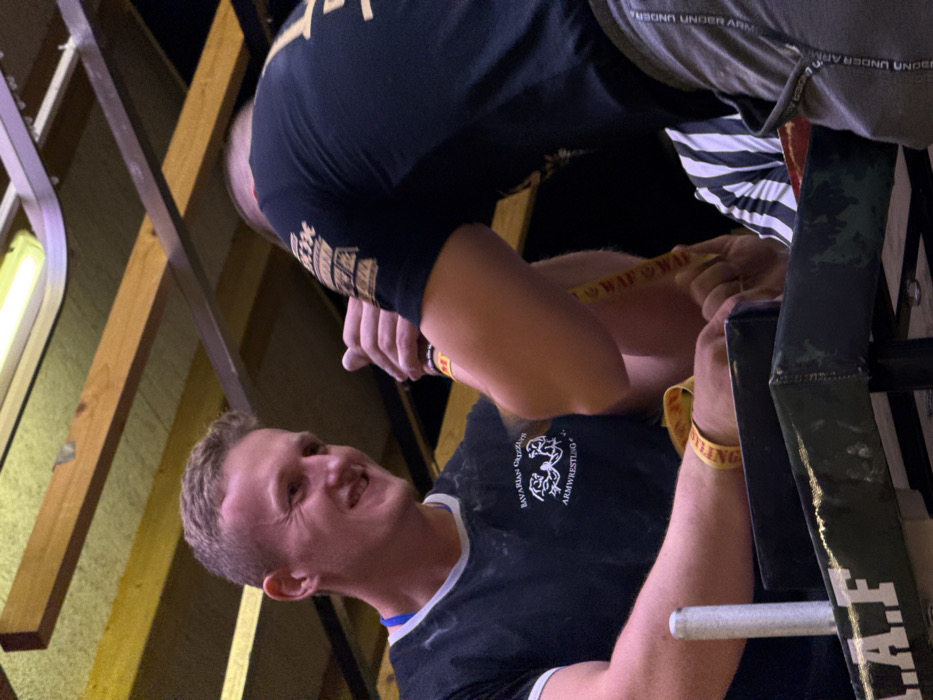 This image depicts an indoor armwrestling match in Reisenberg, Austria
