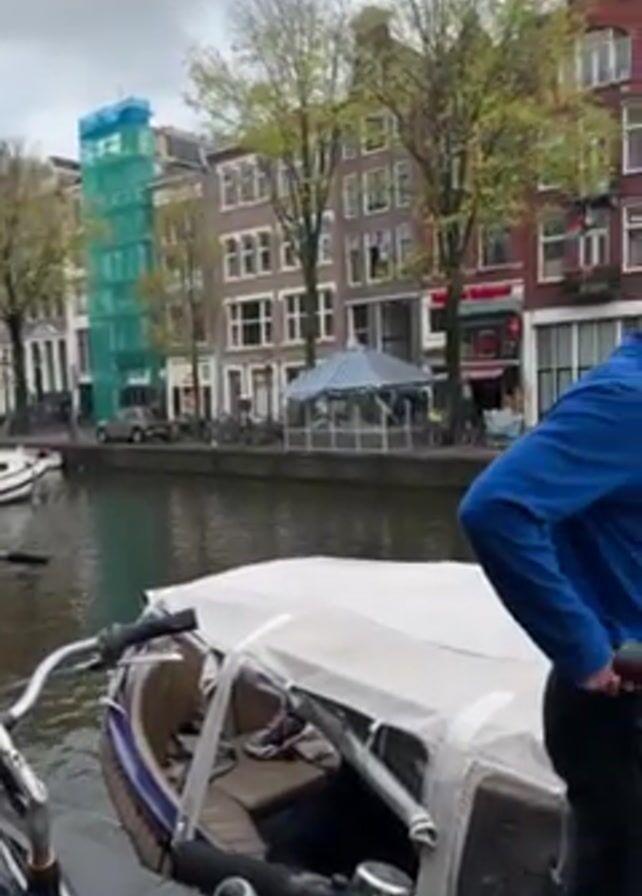 canal in Amsterdam, with buildings lining the waterway. Several bicycles are parked along the edge of the canal. A tour boat, partially covered by a white canopy, is docked along the canal. Two men in blue jackets are standing on the boat with several women. One of the men is gesturing and speaking, possibly giving a tour or instructions. The other man is taking pictures. The women appear to be listening and interacting with each other. The weather is overcast.
