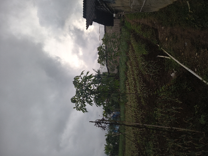 A rural scene shows a small garden patch adjacent to a building. The garden features rows of low-lying plants, interspersed with a few taller saplings. A white PVC pipe runs along the edge of the garden, likely for irrigation. The sky is overcast with thick, grey clouds, partially obscuring the sun. The overall impression is one of simple, agricultural life under a gloomy sky.