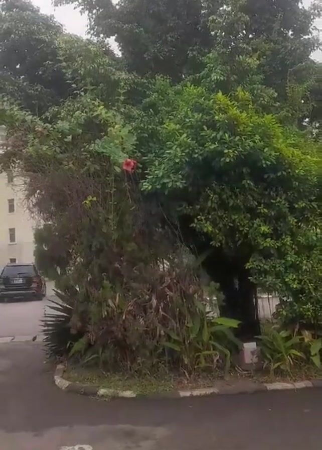 The camera, held by an unseen individual, pans from a roadside bush with a single red flower, revealing a parking lot area in front of a white building. The building is several stories tall and appears to be an apartment complex, with multiple balconies visible. Various cars are parked in the lot, including a black SUV driving away. The sky is overcast, and the area appears damp, judging from the dark patches on the pavement. Several small birds are seen walking along the parking lot surface.