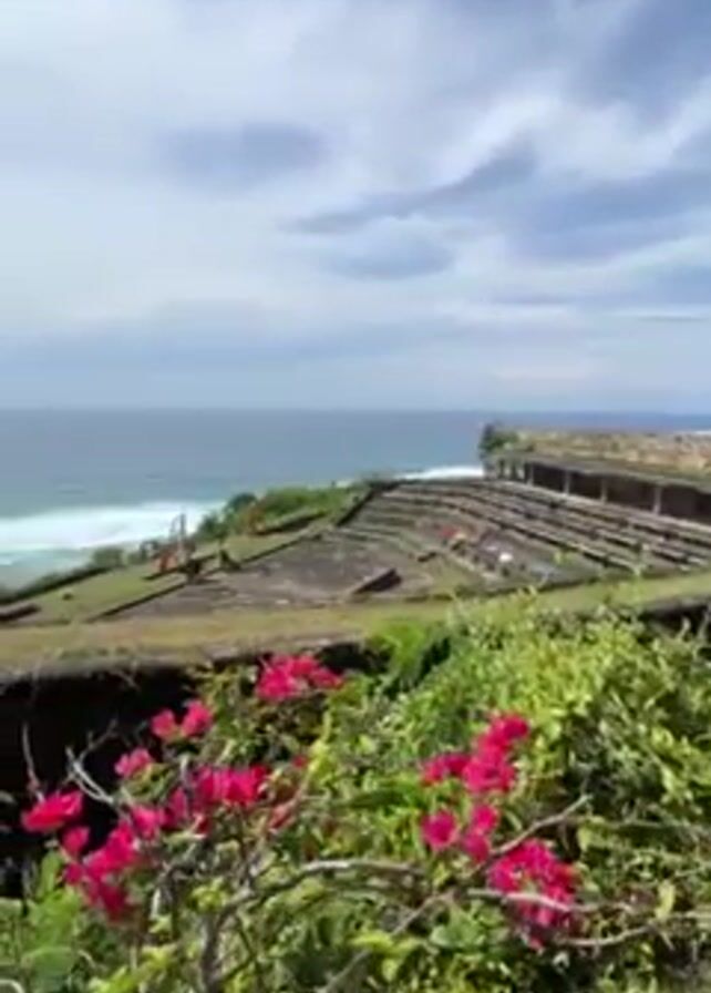 From an elevated position, the video captures a scenic view of a coastal landscape. In the foreground, vibrant pink bougainvillea flowers frame the scene. Beyond the flowers, a terraced structure of stone and grass extends towards the ocean. Red flags are visible on the terraces. The blue ocean stretches to the horizon under a sky with scattered clouds. White waves break along the shoreline.