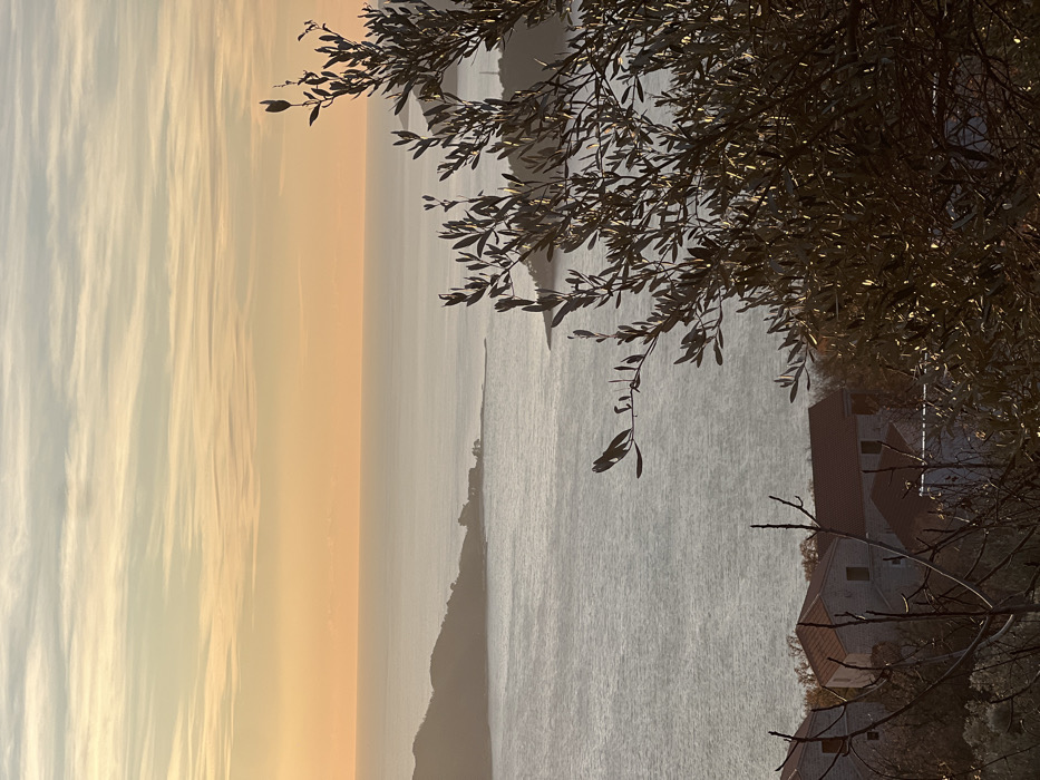 The image depicts a panoramic coastal landscape in Podbadac, Montenegro, captured during either sunrise or sunset. The sky, occupying the upper third, transitions from pale blue with faint white cirrus clouds at the zenith to a prominent golden-orange band along the horizon. Below the horizon, the Adriatic Sea extends across the middle ground, its surface calm with subtle ripples reflecting the muted light. In the mid-ground, a dark landmass forms a bay on the left, curving towards a distinct rocky promontory in the center-left. This promontory hosts several structures with light-colored walls and dark roofs. A less defined landmass is visible further right across the water. The foreground is dominated on the right by a dense, leafy shrub or small tree with dark olive-green foliage, partially obscuring the view. Some of its leaves on the upper right side are subtly illuminated by the warm light. On the lower left, partially visible through sparse, bare tree branches, are several buildings featuring light-toned stone walls and reddish-orange tiled roofs, characteristic of local architecture. No individuals or specific actions are discernible within the scene. The overall lighting suggests a "golden hour" illumination, creating soft contrasts.