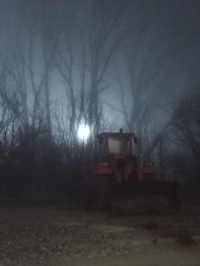 The image depicts an orange heavy machinery vehicle, identifiable as a bulldozer or large tractor equipped with a front-mounted blade, positioned on unpaved ground within a wooded area. The scene is enveloped in dense fog or mist, significantly reducing visibility. In the background, numerous bare deciduous trees are visible, with their branches partially obscured by the atmospheric conditions. A bright, diffused light source, consistent with the moon or a distant luminary, is centrally located behind the vehicle, shining through the fog and trees. The vehicle is stationary and unoccupied. There are no individuals, active operations, or interactions present in the image. The location is in Targovishte, Bulgaria. The ambient lighting is low.