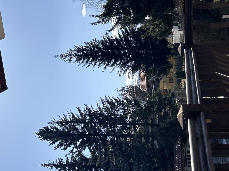 The image displays an outdoor scene in Govedartsi, Bulgaria, viewed from an elevated perspective, likely a balcony, on a clear, sunny day. The lower third of the frame is occupied by a dark brown wooden railing, consisting of vertical balusters and a horizontal top rail. A thick wooden post with a pyramidal cap is prominent on the right side of the railing. The midground is dominated by several tall, dark green conifer trees, likely spruce or fir, which partially obscure the surrounding environment. Between and behind these trees, multiple residential buildings are visible. On the left, a structure with a reddish-brown tiled roof is partially seen. To the right, a yellow-painted building with a dark roof is present, situated behind a fence line. A small gazebo with a reddish-brown tiled roof is partially visible on the far left, behind the foreground railing. In the background, snow-capped mountains are discernible beneath a bright, clear blue sky containing a few sparse white clouds. The scene is brightly illuminated, indicating direct sunlight. No people or animals are visible, and no actions or interactions are depicted.