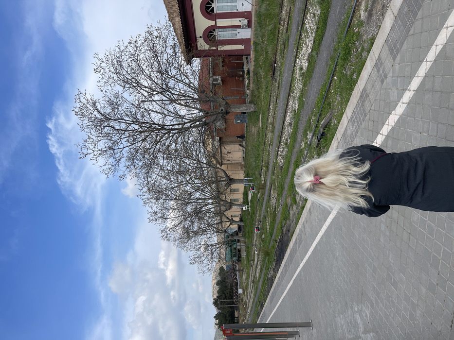 The image depicts a train station in Buñol, Spain, observed from a platform looking down the tracks. In the foreground, a single individual is positioned with their back to the viewer, standing on a gray tiled platform with a white safety line. This individual has long, wavy blonde hair secured with a pink hair clip and is wearing a dark, long-sleeved coat or jacket, with a dark strap visible over their right shoulder. Parallel to the platform, multiple sets of train tracks are visible, embedded in gravel and partially overgrown with green vegetation. Across the tracks, a series of structures stand. To the immediate right, a building with a red-tiled roof, light-colored walls, and distinctive red trim around two arched windows or doors is present, possibly the main station building. An external air conditioning unit is mounted on its side. Further down the tracks, a line of single-story buildings with light brown walls and dark roofs are visible, interspersed with bare deciduous trees suggesting late winter or early spring. One white plastic chair is discernible near one of these buildings. In the far distance to the left, low hills or mountains are under a partially cloudy blue sky with scattered white clouds.