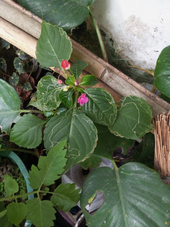The image captures a close-up view of vegetation located in Bhendala, India. A central plant, identified by its green, ovate leaves, displays both developing red flower buds and open pink flowers. Multiple leaves on this primary plant show prominent light-colored, serpentine trails indicative of leaf miner activity. Behind this plant, three weathered bamboo stalks are arranged horizontally. In the upper right background, a light-colored wall, possibly concrete or stucco, exhibits areas of discoloration and staining consistent with moisture exposure. Other green plants are visible, including a large, dark green leaf with an irregular hole and a plant with smaller, serrated leaves in the lower left. Portions of dark-colored containers or pots are visible at the bottom of the frame. No human individuals or animals are present within the scene.