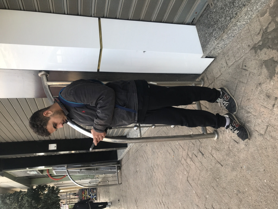 A male individual, approximately 20-30 years old, with short, curly dark hair and a beard, stands on a paved sidewalk, leaning against a silver metallic railing
