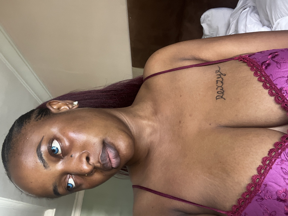 This image depicts a female individual of dark complexion, situated indoors in Fagge A, Nigeria. She is shown from the chest up, with her head turned to her left, her gaze directed away from the camera. Her eyes contain blue contact lenses, and she wears a small gold stud nose piercing on her left nostril, along with a small stud earring in her right ear. Her hair is dark reddish, styled with braids at the hairline. A tattoo spelling "Rexzye" in a cursive font is visible on her upper right chest. She is dressed in a fuchsia-colored garment featuring thin spaghetti straps and a decorative lace or embroidered trim along the neckline. Visible stretch marks are present on her upper chest. The background, out of focus, reveals a light-colored wall with molding to the left, and a dark brown surface, likely a headboard, with crumpled white bedding to the right, consistent with a bedroom environment.