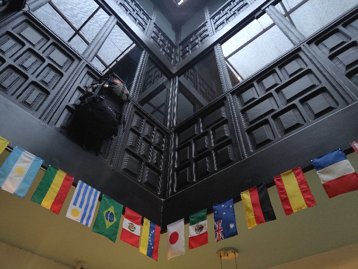 A low-angle shot showcases the corner of a dark, multi-paneled window structure. At the corner, a dark backpack is seen hanging. A decorative string of international flags is suspended below the structure. The flags, including those of Argentina, Brazil, and Spain, add a vibrant contrast to the dark wood. The overall composition draws the eye upward, highlighting the architectural detail and the global theme of the flags.