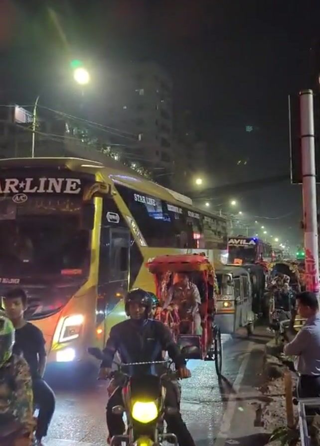 The video depicts a nighttime urban scene in what appears to be Bangladesh, characterized by heavy traffic