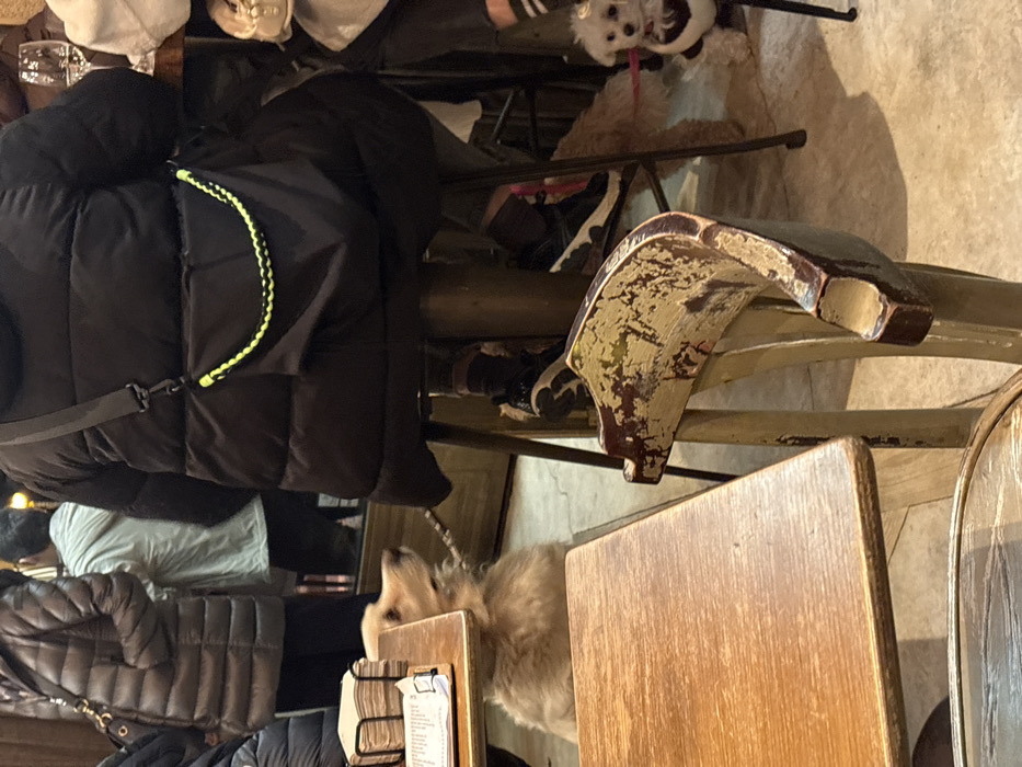 A dog stands by a stack of menus and a wooden table, looking upward. A person in a dark puffer jacket with neon green details sits at the table. Another person wearing a light green top is seated nearby. Legs and shoes are visible under the table. An old, worn chair is also present.