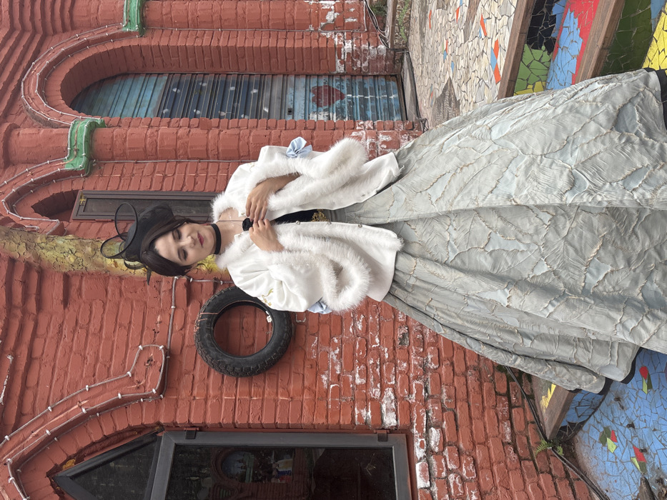 A female subject stands outdoors in Baqiao, China, against a weathered red brick building. The structure features multiple arched openings outlined with white electrical conduit and intermittent green painted sections. A dark-framed window is visible within the leftmost arch, reflecting an internal scene. To the subject's right, a light-blue corrugated metal door with a faint red heart graffiti is present within another arch. A black tire is affixed to the brick wall behind the subject's left shoulder. The female wears a white, short-sleeved jacket extensively trimmed with white faux fur on the collar, cuffs, and front opening, revealing light blue lining or accents on the sleeves. Beneath, she has a black top and a black choker necklace with a dark pendant. Her lower attire consists of a voluminous, floor-length skirt in a textured light-blue fabric with a patterned surface resembling leaves or feathers, featuring a dark bottom hem. Her dark hair is styled up, topped with a black fascinator. She is positioned facing forward, with her head slightly tilted downwards and to her right, and her hands are clasped together at chest level, resting on the fur trim of her jacket. A faint smile is visible on her face. The ground around her is composed of irregular, multi-colored mosaic tiles arranged in stepped levels. Small green vegetation grows from a crevice at the base of the brick wall on the left. The scene is illuminated by diffuse natural light.