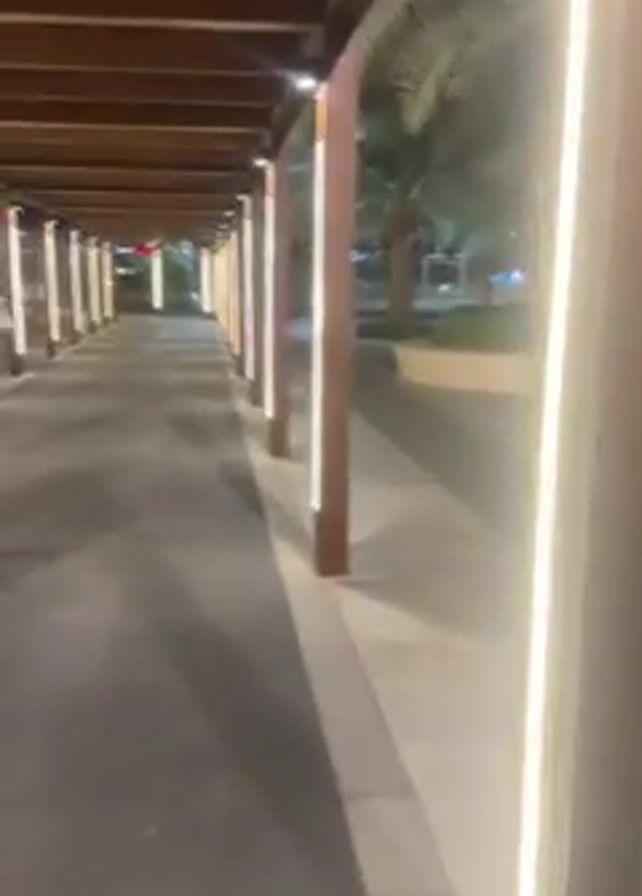 person walking at night through a covered walkway with vertical light strips. The walkway has a brown wooden structure. There are palm trees to the side and streetlights in the distance. The walkway opens up to an open space where a woman is walking in front of a building. The building has a large blue logo.