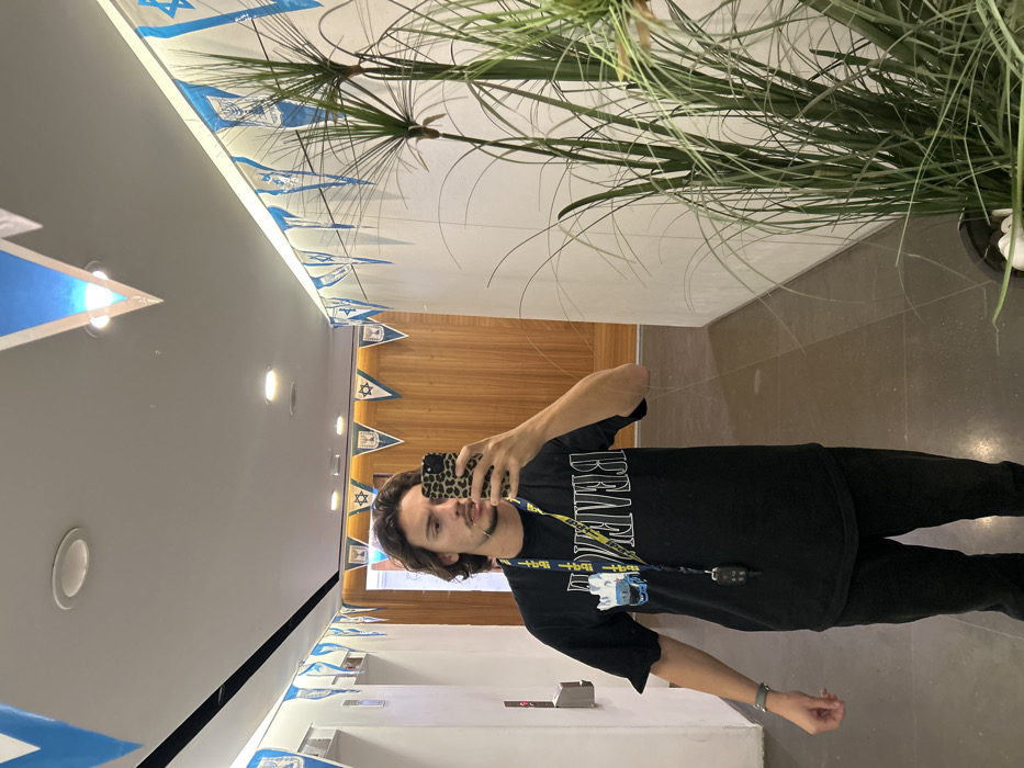 The image depicts a male individual in a mirror selfie within a brightly lit interior hallway, located in Tel Aviv, Israel