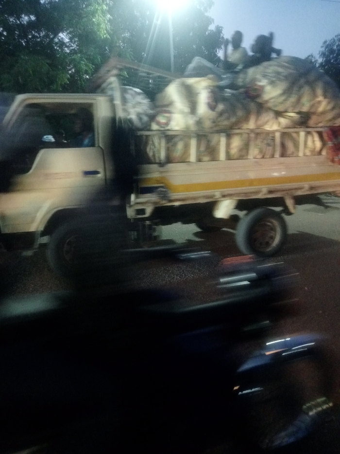 A white-colored truck is observed in motion on a paved road in Dabawa, Nigeria, under low light conditions, likely dusk or night. The truck's cab shows a partially obscured individual in the driver's position. The cargo bed is significantly overloaded with numerous large, light-colored sacks, appearing to be textile or grain bags, stacked well above the bed's side rails. At least two individuals are perched atop these sacks in the rear of the truck. The background reveals silhouetted trees against a dark sky, illuminated by a prominent overhead light source causing significant glare. The foreground and lower half of the image exhibit motion blur, indicating the vehicle's movement. A yellow stripe is visible along the side of the truck's cargo bed.