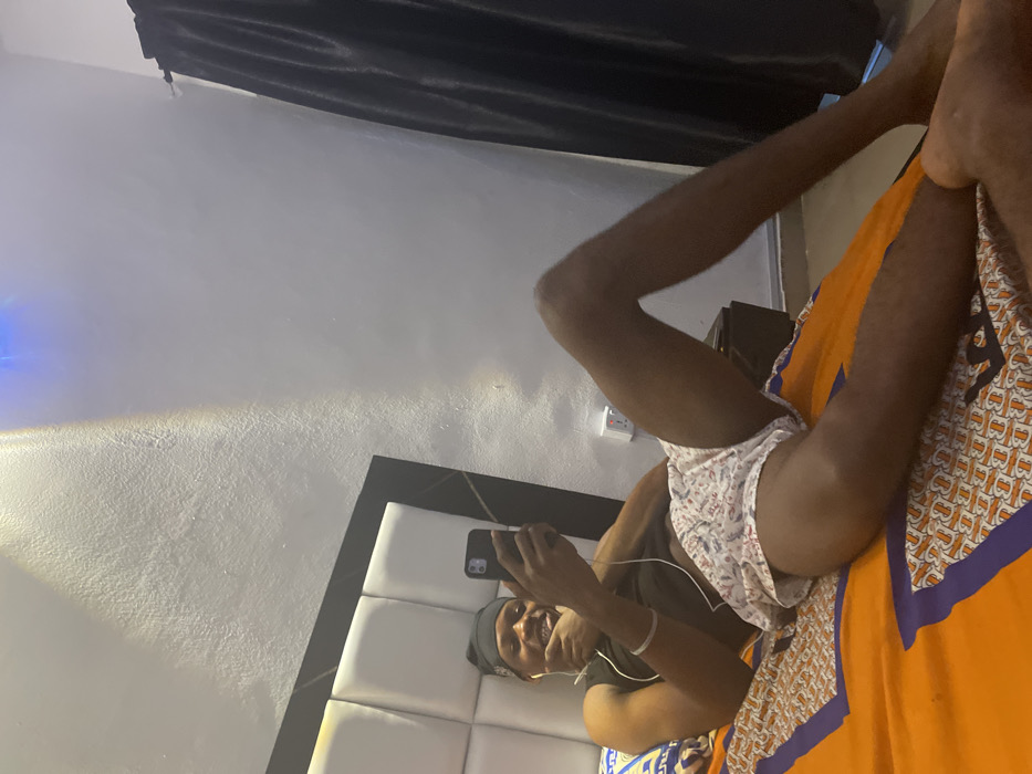 A person lies on a bed, holding a smartphone, possibly taking a selfie. They wear a beanie, a bracelet, and shorts with a floral pattern. The bed is covered with a patterned orange and blue bedspread. Behind them, the headboard is padded white leather. A black curtain is visible at the top of the image, and a white wall is on the left. The photograph appears to have been taken at an angle.