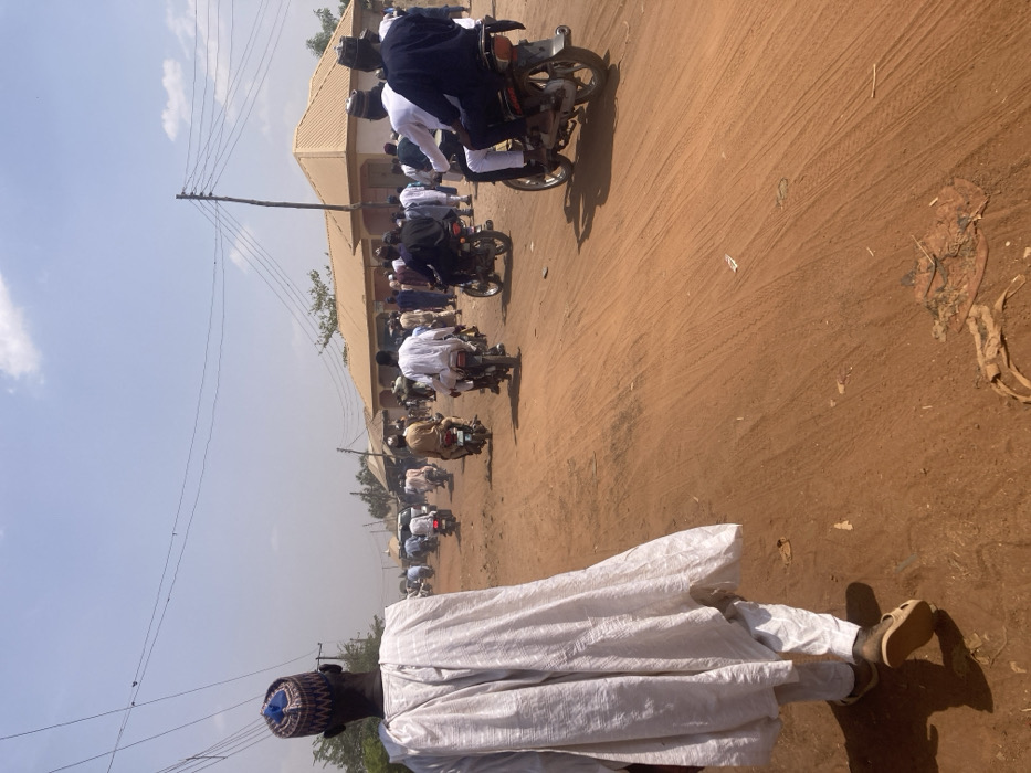 The scene depicts an unpaved, red-brown dirt road in Minna, Nigeria, under a bright, hazy sky. In the foreground, a male individual, viewed from behind, walks leftward away from the camera. He wears a white flowing garment, a patterned blue, red, and white cap, and tan sandals. The road surface exhibits multiple tire tracks and scattered debris. In the midground and background, a substantial number of individuals, predominantly male, are present on the road. Many are operating or riding motorcycles, some carrying passengers. The motorcycles are primarily dark-colored. People are dressed in various traditional attires, including white and dark-colored flowing garments and caps. Single-story buildings with light-colored facades and yellowish-brown corrugated metal roofs line the road in the background. Utility poles with multiple overhead power lines are visible against the sky. The environment suggests an active urban or semi-urban setting, characterized by sunlight casting shadows to the left of subjects.